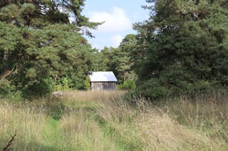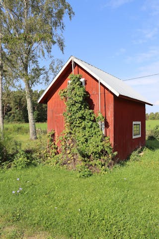 Mindre bod om 13 m² enligt försäkringsbrev. Träbyggnad under tak av plåt.