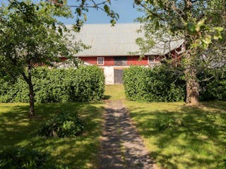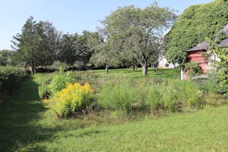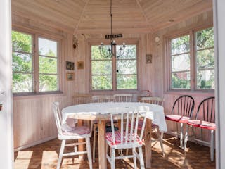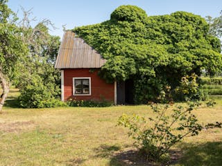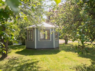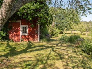 Lummig och gemytlig trädgårdstomt med syrenhäckar, humleodlingar, trädgårdsland och fruktträd. Gott om plats för odling, avkoppling och lek. I lusthuset kan man njuta av mysiga middagar. Uppfört i trä under tak av plåt med klinkergolv.