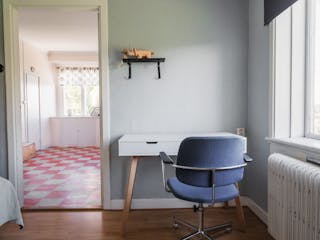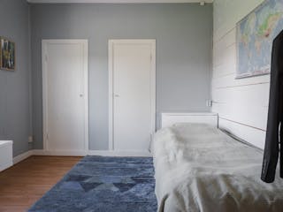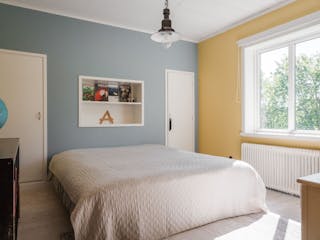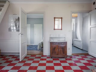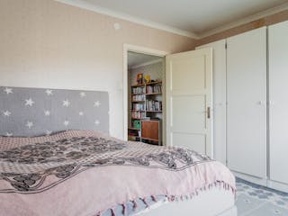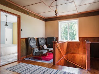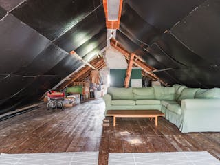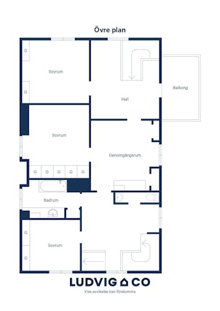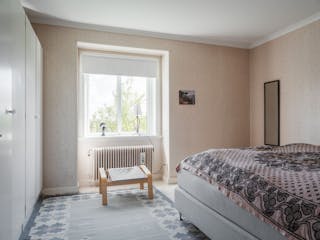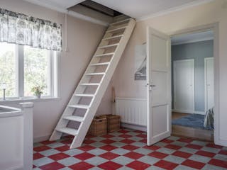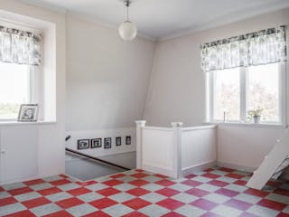 Övervåningen har en hall med trägolv och utgång till balkong. Från balkongen har man utsikt mot Levide kyrka. Sovrum med trägolv och 2 garderober. Genomgångsrum med plastmatta och 2 garderober. Sovrum med plastmatta på golvet och 5 garderober. Äldre badrum med våtrumsmatta, tvättställ och badkar (ingen WC). Hall med klickgolv samt trappa till loftet och ned till köket. Äldre WC-rum med tvättställ och WC. Sovrum med klickgolv och 2 garderober. Loft främst till förvaring.