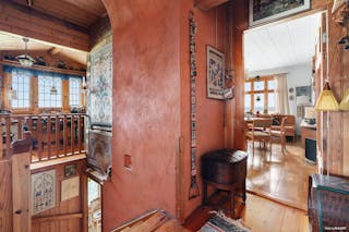 Övervåning – trapp mellan två murstockar i mitten av huset; barnrum med snedtak; mindre äldre kök och sovrum (snedtak); badrum med badkar, wc, handfat och tvättmaskin; två gavelrum, var och en med öppen spis; förråd i kattvindar.