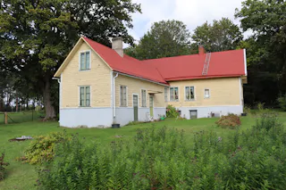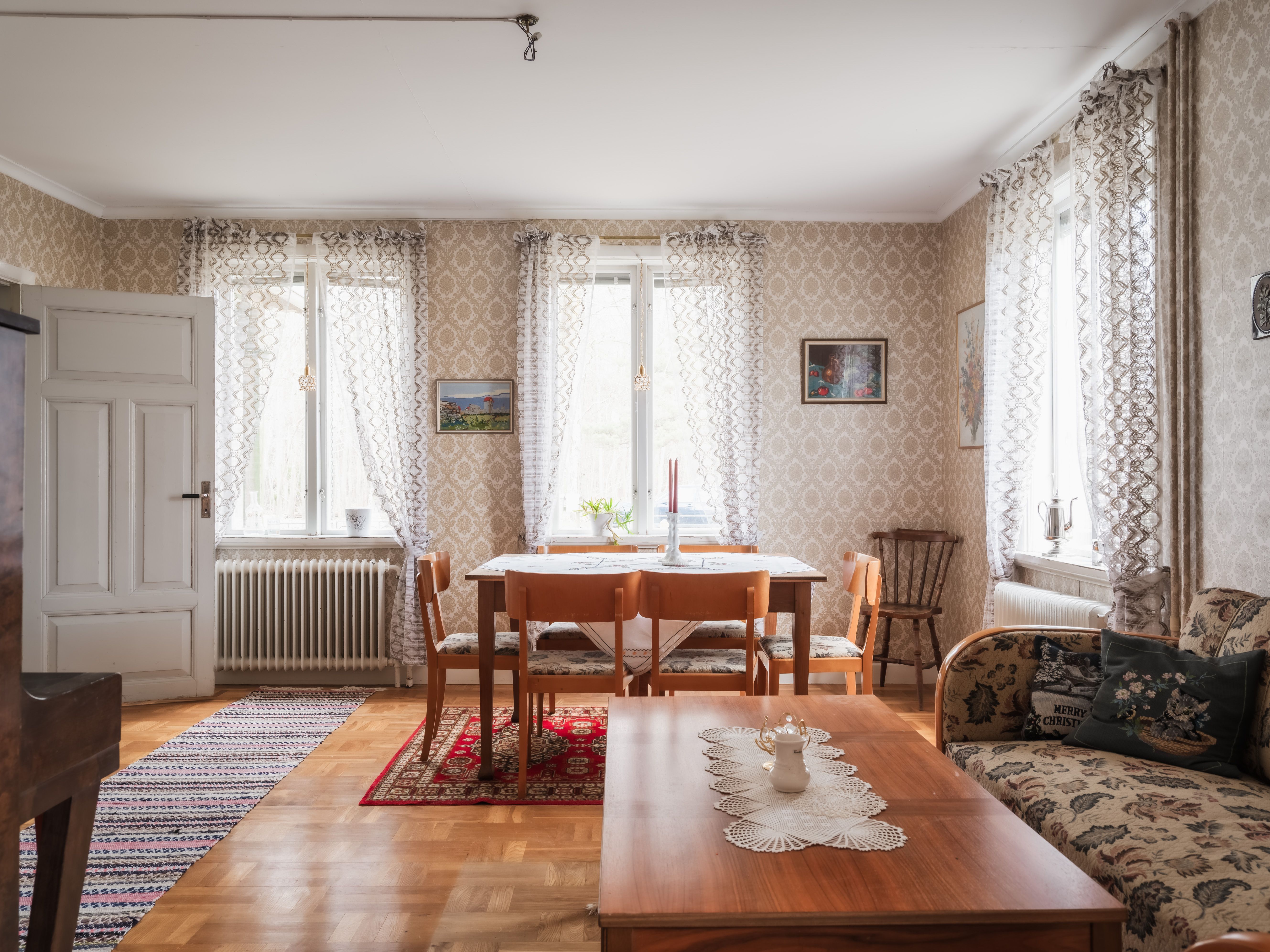 Mangårdsbyggnad uppförd under början av 1900-talet och därefter tillbyggd med bakbygge/flygel år 1937 samt moderniserad år 1948. Träbyggnad i 1,5-plan samt källare. Tak av plåt och kopplade 2-glasfönster. Boarea om 120 m² enligt försäkringsbrev (94 m² enligt taxeringsuppgifter). Vattenburen värme via oljepanna från Parca (1987) med brännare från år 2000. Eget vatten ("tjänligt med anmärkning" enligt nytaget vattenprov) samt avlopp i form av en äldre 3-kammarbrunn, infiltration saknas. Avloppsanläggningen måste åtgärdas av köparen och ansökan om avloppstillstånd behöver göras inom kort efter köpet. Fastigheten saknar fiberanslutning.