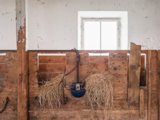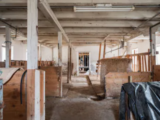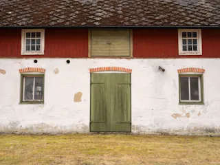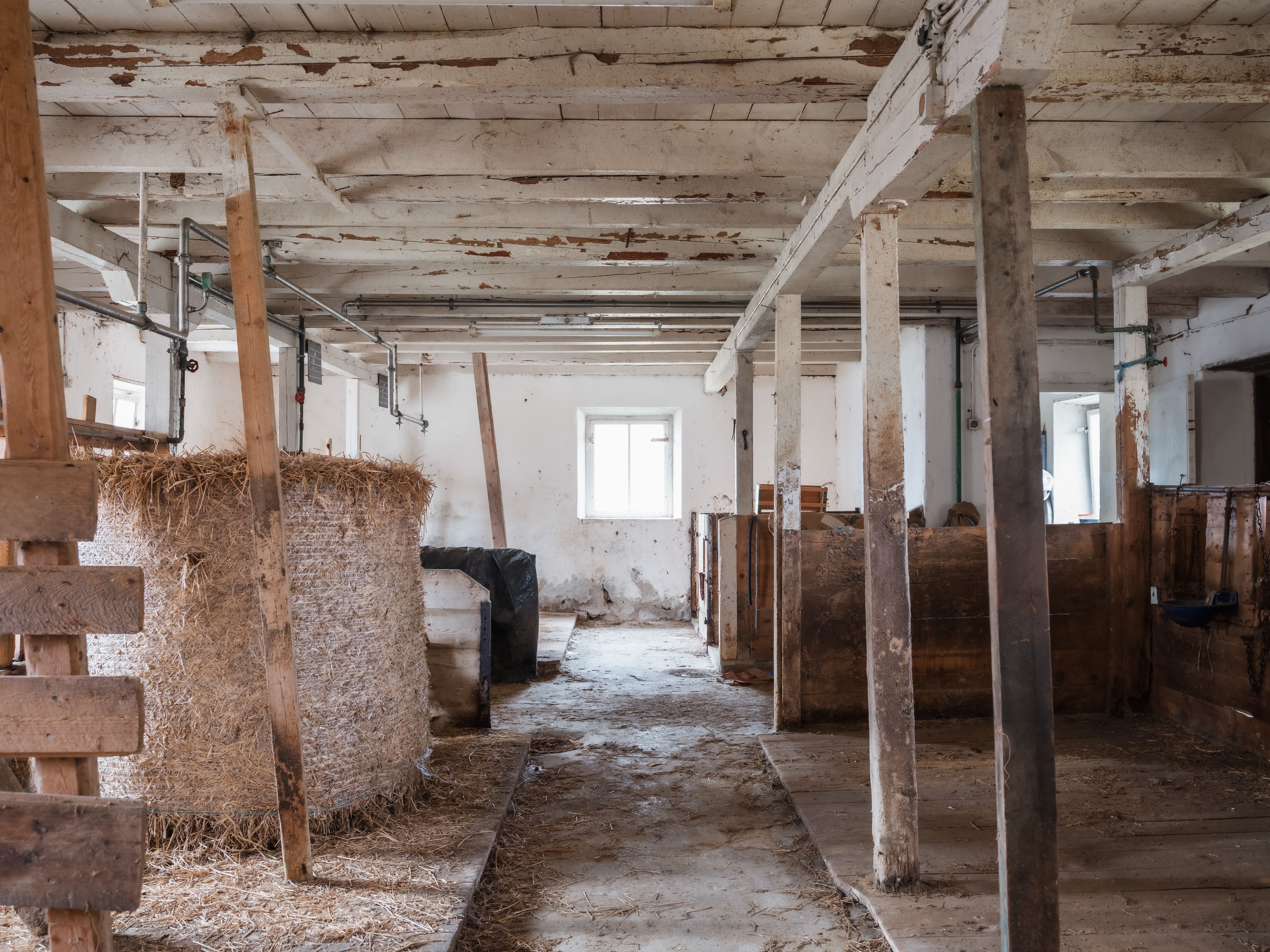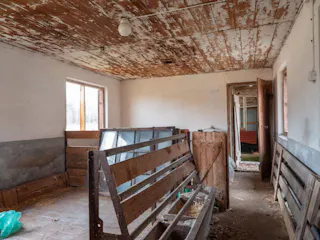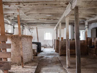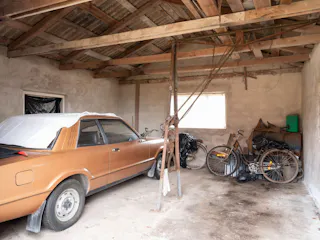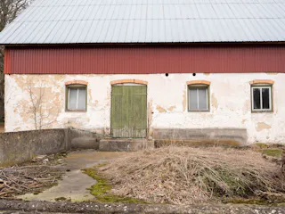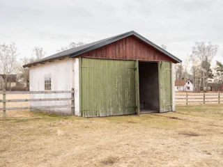 Stenbyggnad under tak av plåt (eternit under). Betonggolv samt dubbla portar.