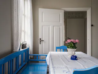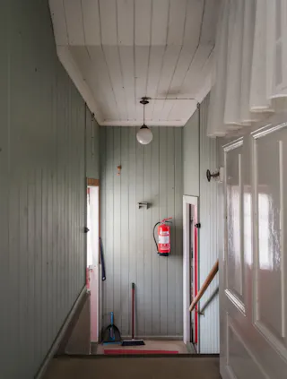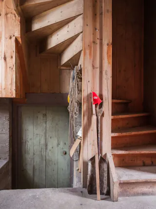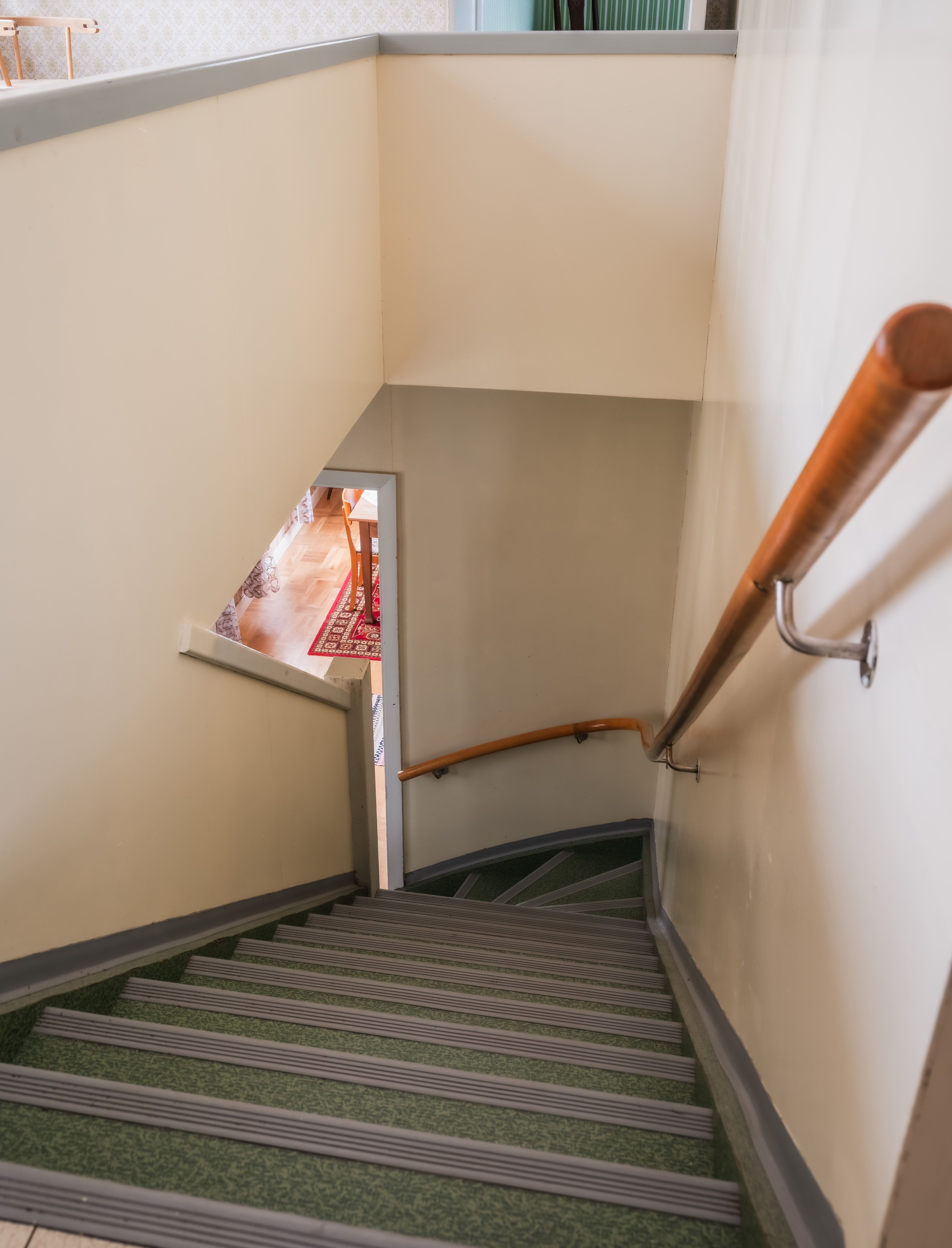 Verkstadsdel samt bryggarhusdel med bland annat kölnu. Loft ovanför. Ligger på husets ena gavel med ingång vid groventrén. Mindre källardel med hydrofor. Bottenplanet i huset inrymmer äldre badrum med badkar. Kontor/kammare. Hall och därefter nästa sovrum/kammare. Vardagsrum med parkettgolv. Kök med matplats och skafferi. I köket finns spis, kyl samt en vedspis (oklar funktion, ej använd på länge). Finentré med trappa till övervåningen. Sal med parkettgolv och öppet mot salskammaren. Finentrén nås via veranda på husets framsida.