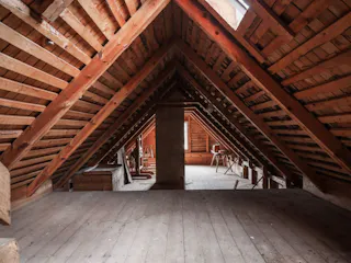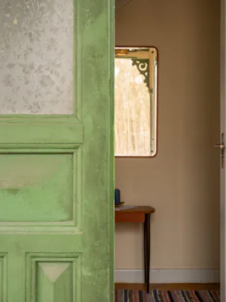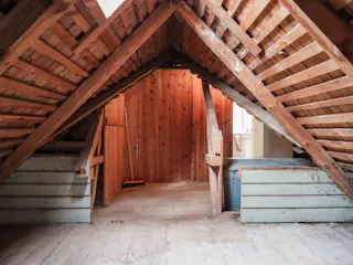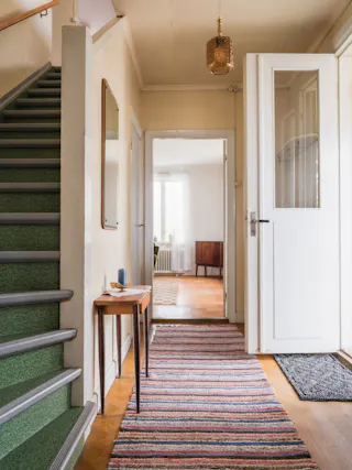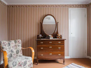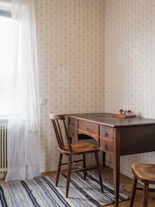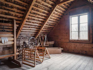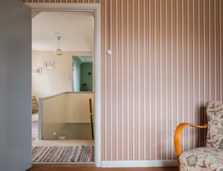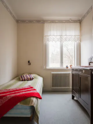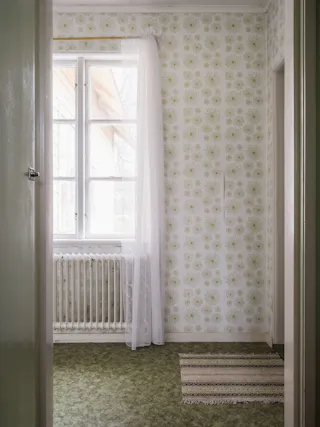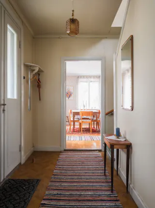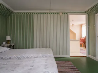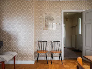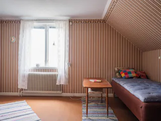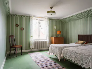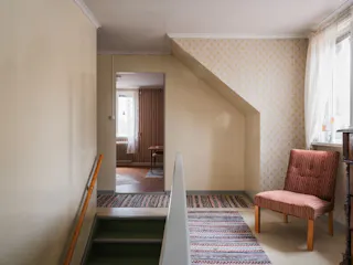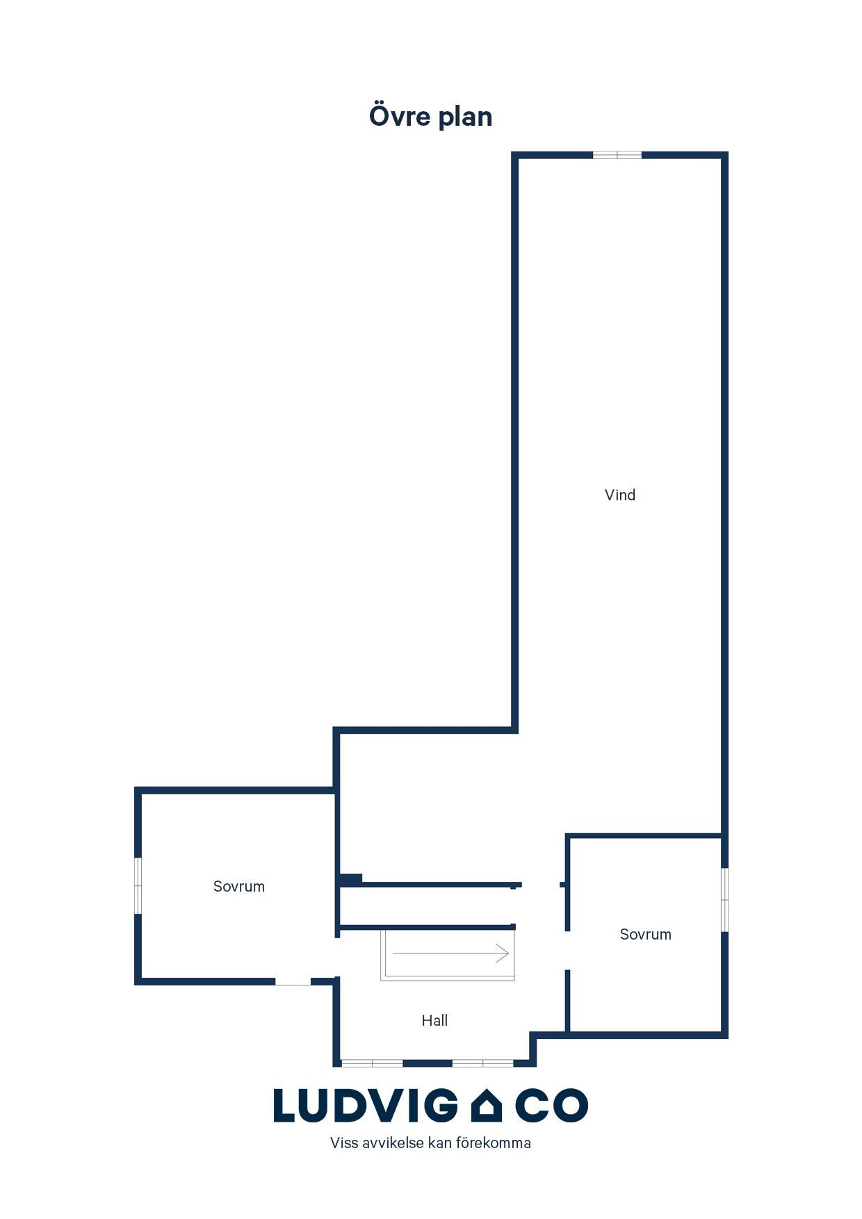 På övervåningen finns en hall, två sovrum samt en rymlig oinredd vind.