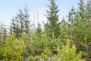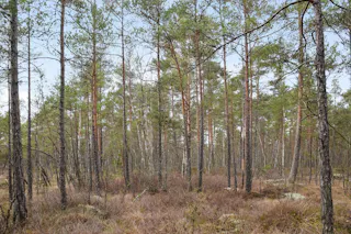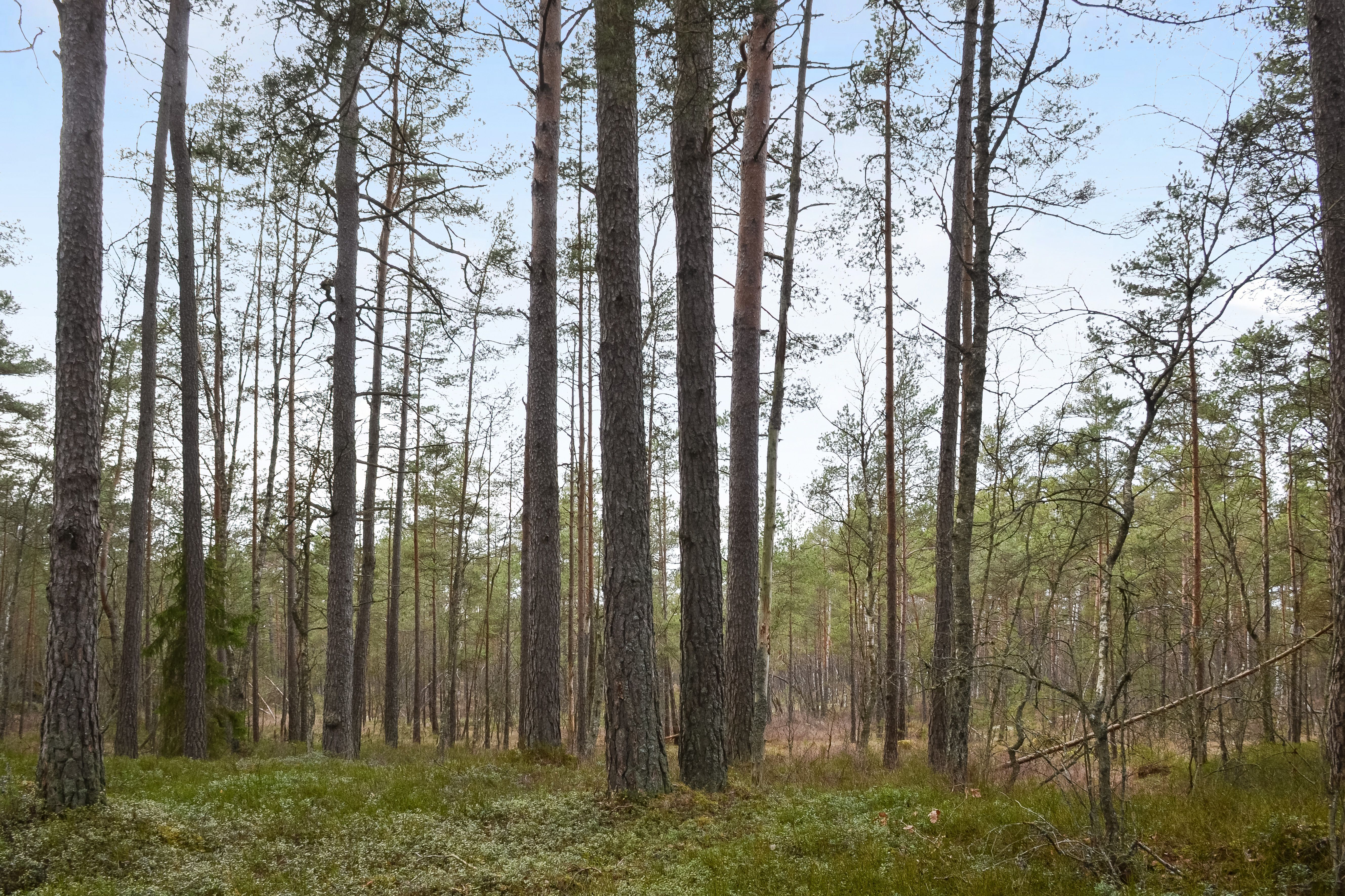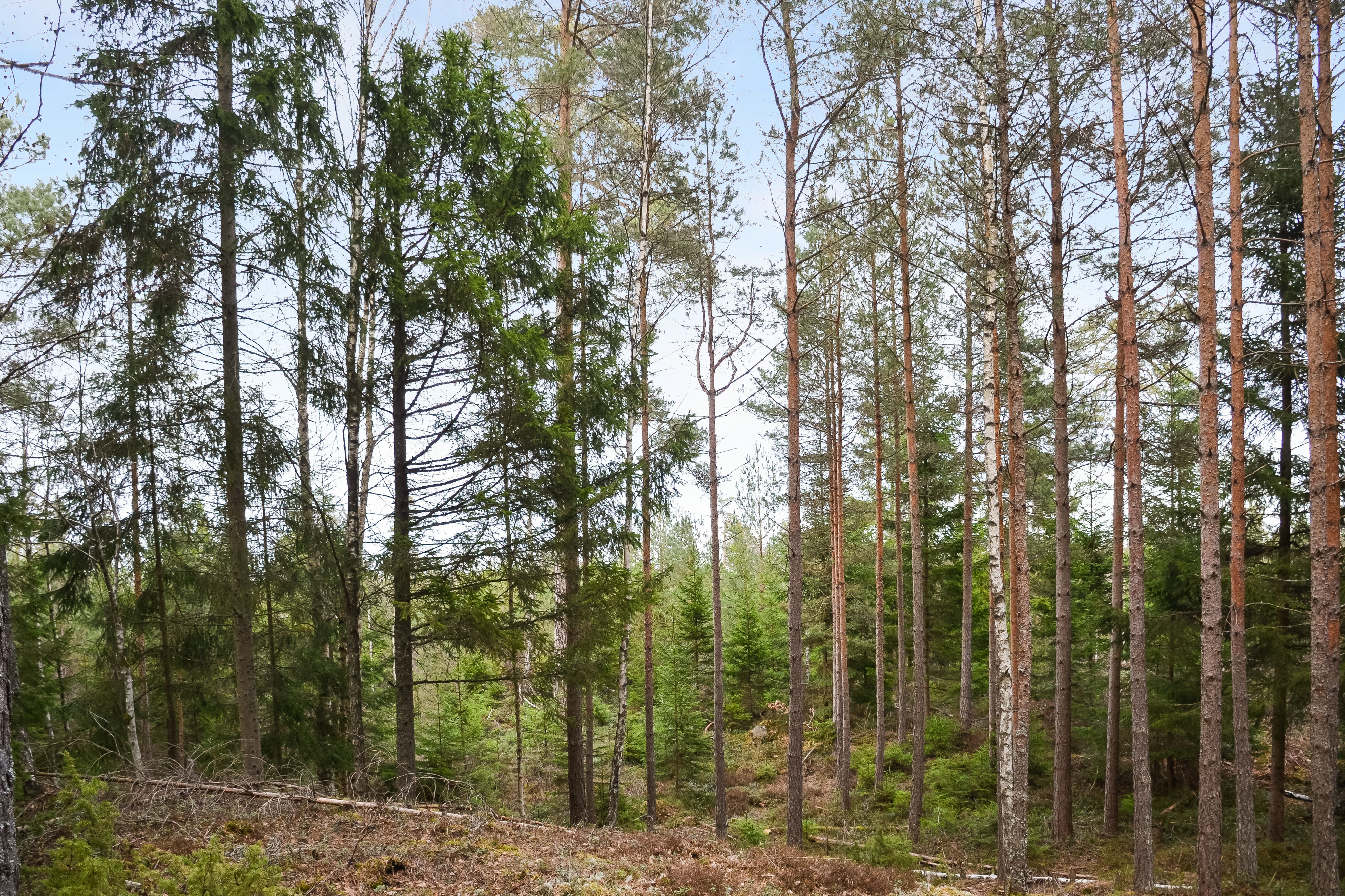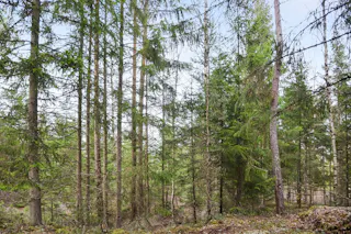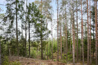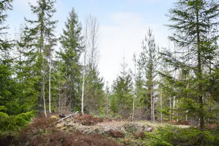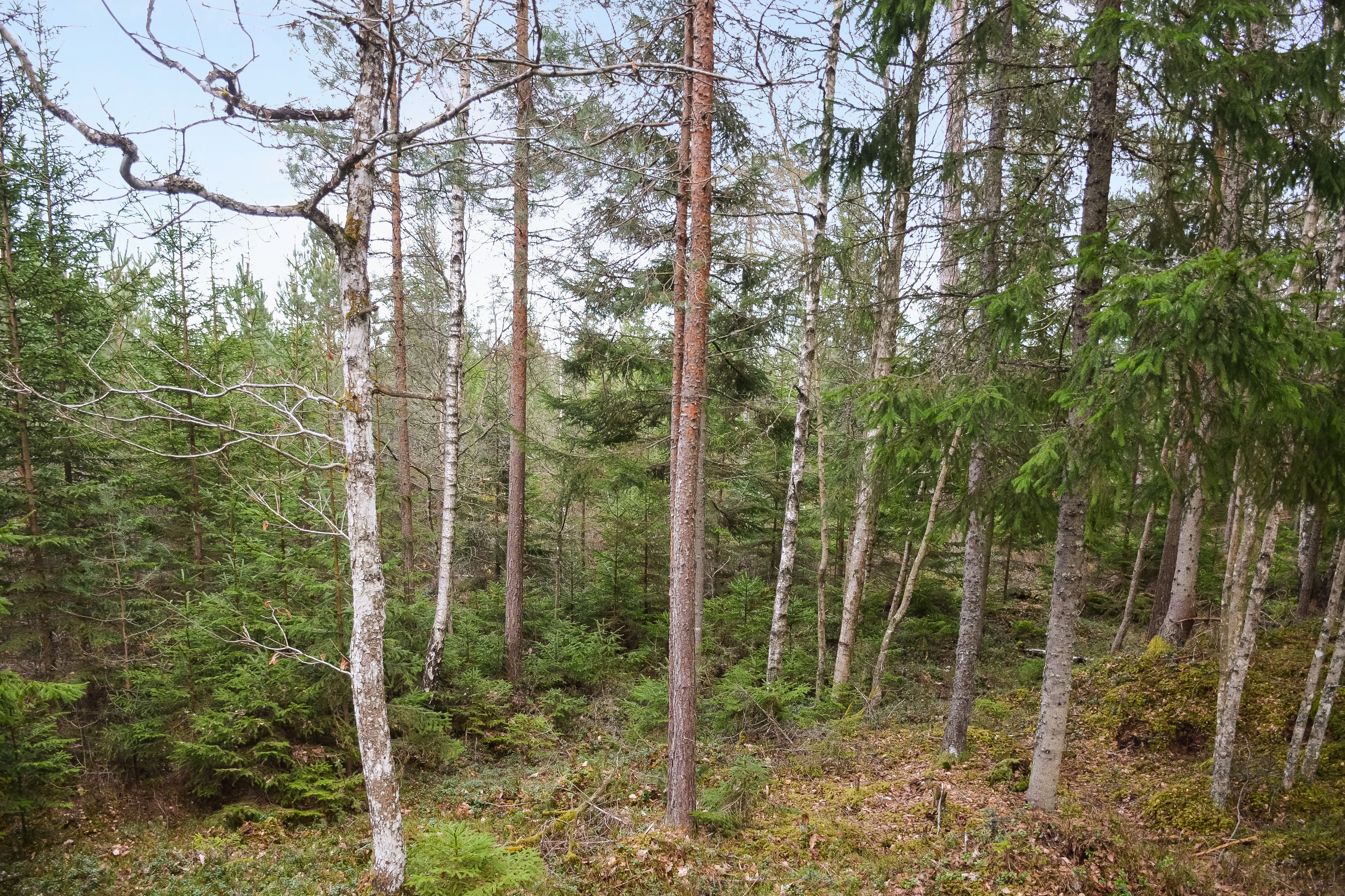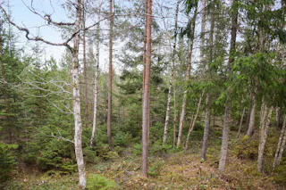 Trädslagsfördelningen utgörs av 30 % tall, 34 % gran och 36 % löv.