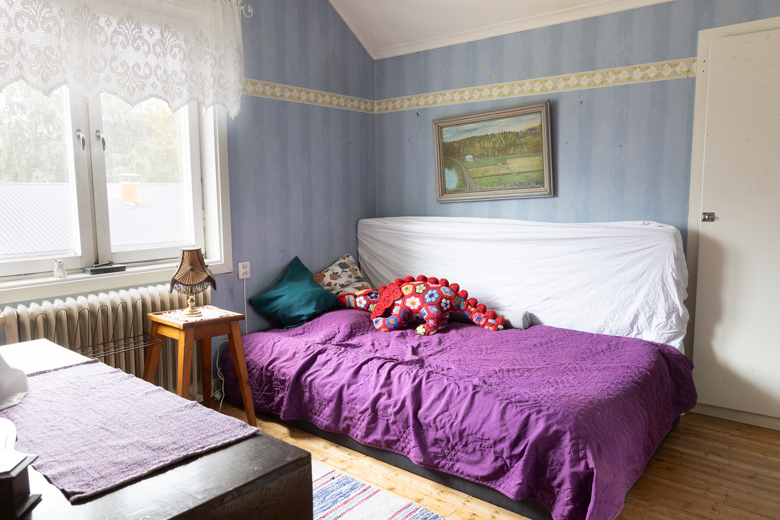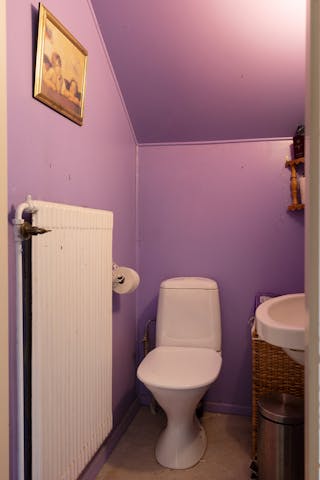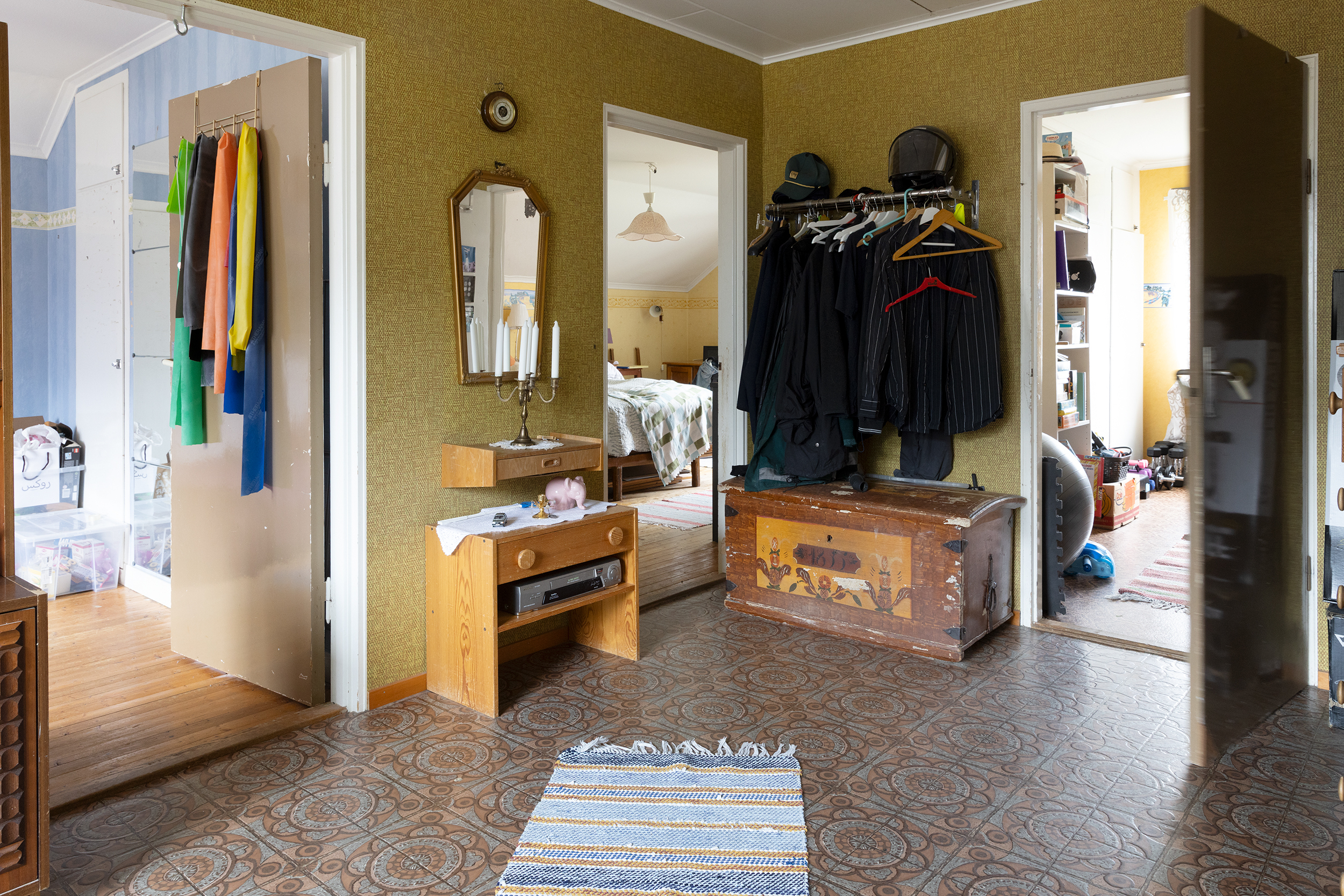 Sovrum 1 är ljust och trivsamt med trägolv och blårandig tapet, medan sovrum 2 erbjuder trägolv, ljusgul tapet och praktiska inbyggda garderober. Härifrån nås även en balkong – en härlig plats för morgonkaffet eller kvällssolen. Sovrum 3 har rödbrun golvmatta, gul tapet och garderob för förvaring. Från hallen nås dessutom en mindre WC.