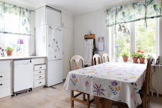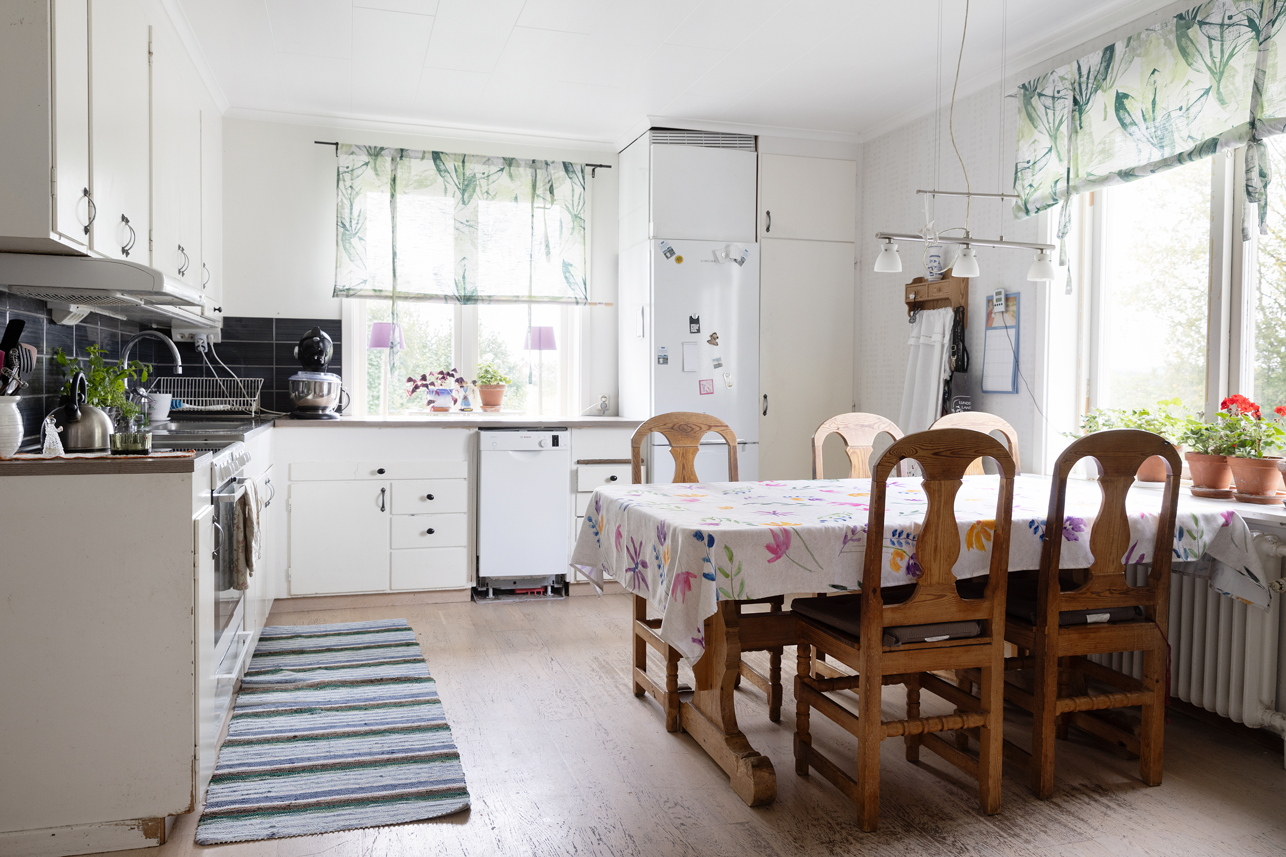 Köket är ljust och trivsamt, med vita skåpsluckor och elegant svart kakel ovanför diskbänken. Fönster i två väderstreck ger ett härligt ljusflöde och en luftig känsla. Här finns äldre trägolv, vitmålade väggar och maskinell utrustning bestående av spis med häll, fläkt, diskmaskin samt kombinerad kyl och frys.