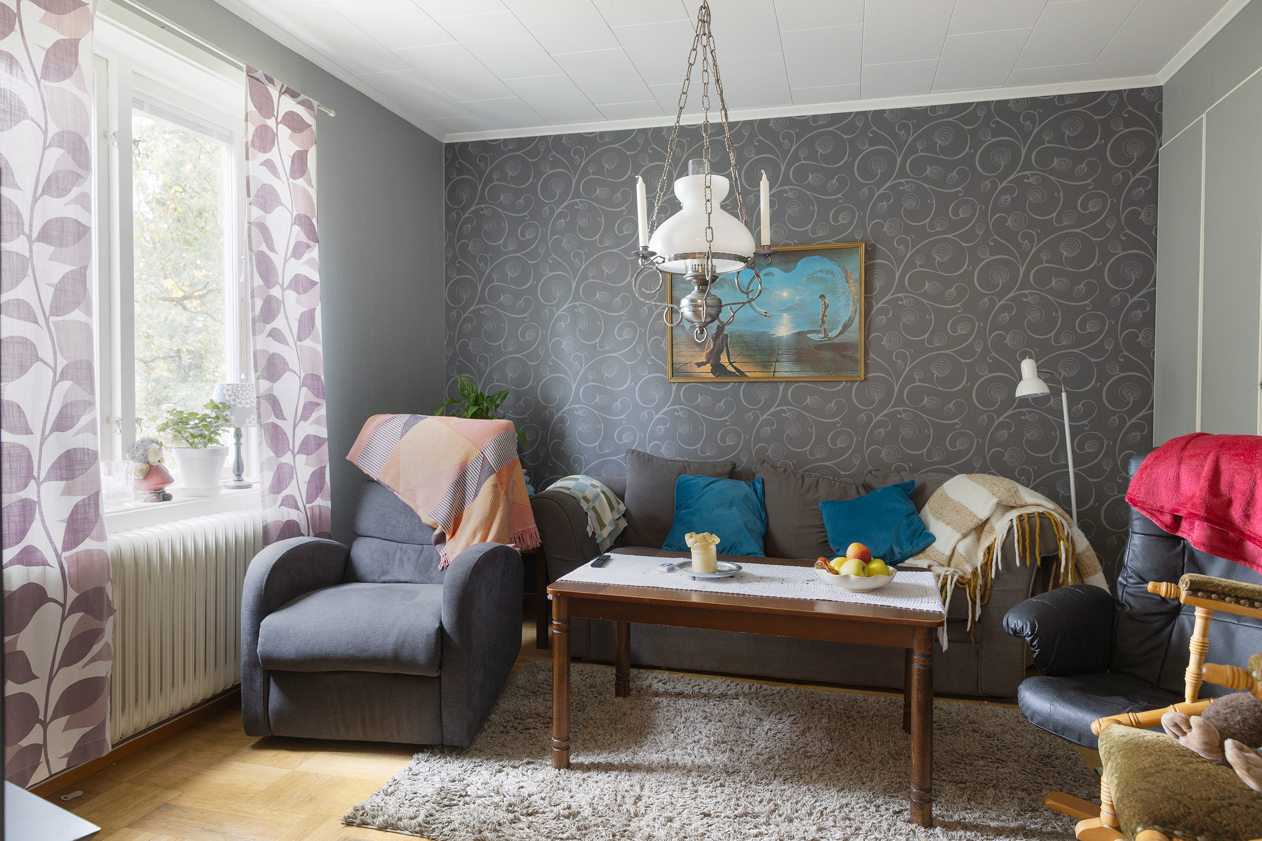 Vidare finns ett trevligt TV-rum – som även kan användas som sovrum – med parkettgolv och grå tapet. Vardagsrum med vacker fiskbensparkett och ljusa väggar, perfekt för både umgänge och avkoppling. På detta plan finns även ett smakfullt nyrenoverat badrum med dusch, WC och modern badrumsmöbel.