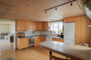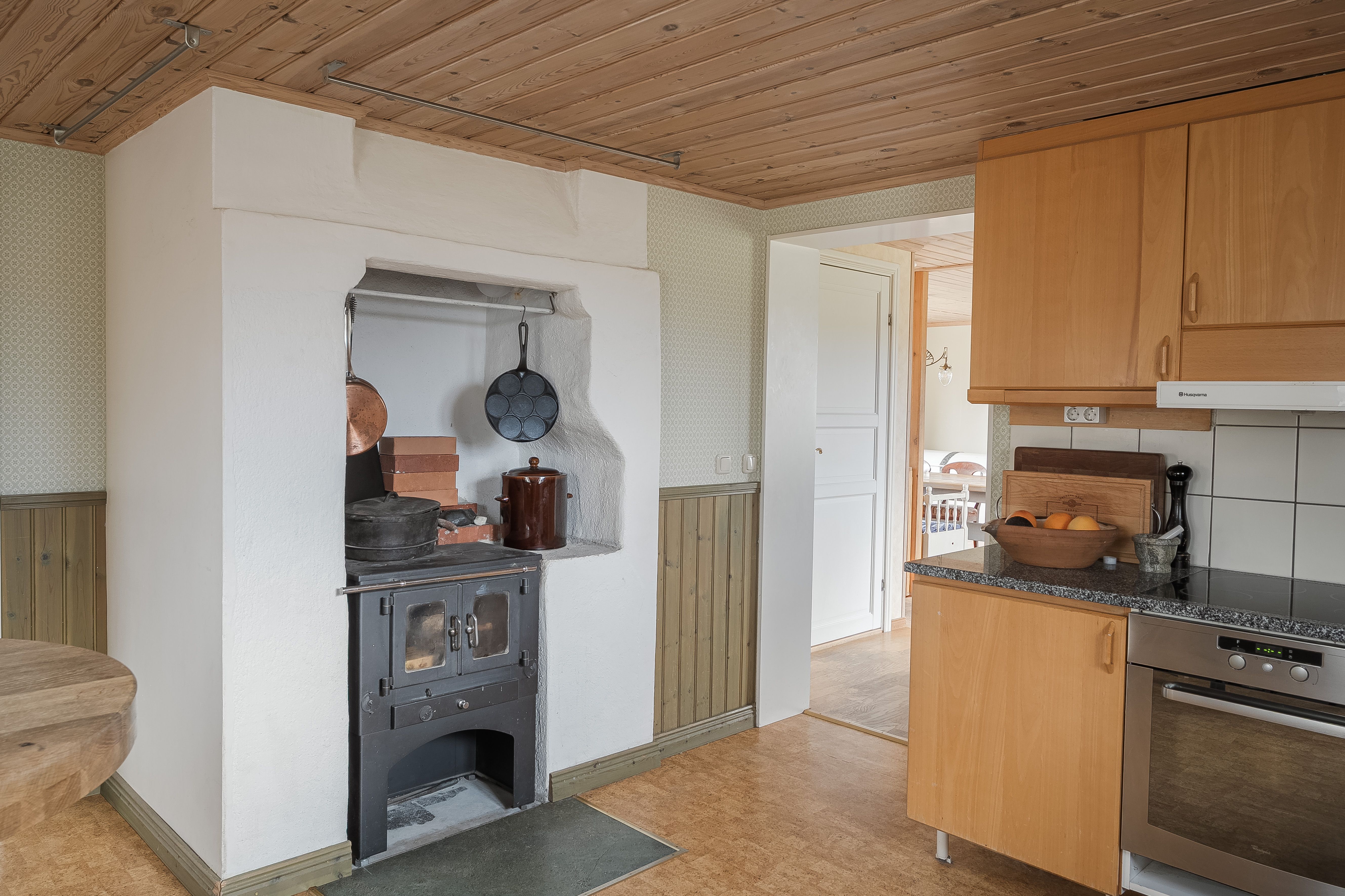 Kök med kyl och frys från Bosch, diskmaskin från Miele, stenskiva, induktionshäll, ugn och vacker järnspis.