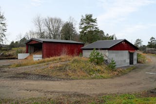 På gården vid brukningscentrum finns förråd och förrådslika containrar som kommer att stå kvar vid försäljningen.