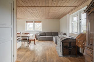Vardagsrum med ekparkett, fönster åt tre väderstreck och utgång till altan.