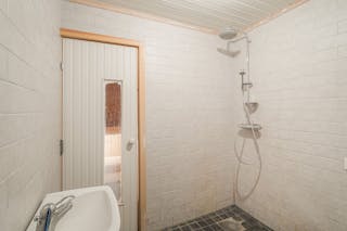 Duschrum med kakel, klinkergolv, dusch och bastu (med aggregat som inte är installerat). I duschrummet finns idag ingen wc men utrymmet är förberett för wc (vakumtoalett).
