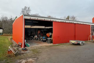 Stor maskinhall med betongplatta, stålstomme från Bjurevall, plåtfasad och plåttak. Den ena delen är ca 15x24 meter och den andra delen är ca 15x18 meter. Här finns höga skjutdörrar som skjuts längs stora delar av fasaden vilket skapar lätt åtkomst till olika delar av byggnaden. Storleken och höjden på portarna skapar möjligheter för olika verksamheter. I ena delen av maskinhallen finns ett isolerat kontor.