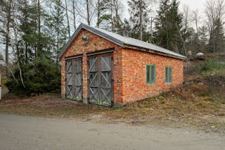 Ute på markerna finns ett garage med vacker tegelfasad och dubbla portar.
