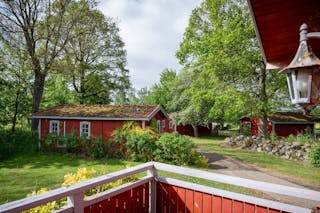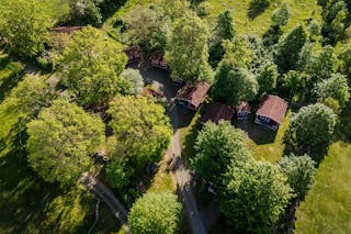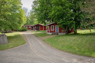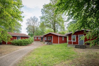 Stugby med åtta charmiga stugor på 25–35 kvm, vackert placerade i en lummig parkmiljö – idealiska för uthyrning eller gäster