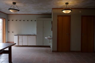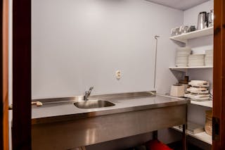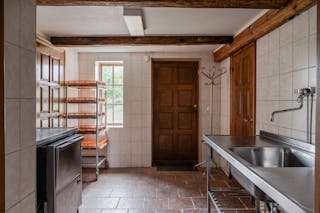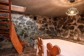 Inrymmer större rum för konferens/umgänge, utrustat med vedeldad spis. Kök med bardisk (kyl/frys, spishäll, fläkt, ugn, mikro) och matplats, kapprum, helkaklat badrum. Två rum som sovrum eller kontor, förråd. Stor matsal med utgång till innergård, serveringsrum och gästwc. Fullt utrustat och godkänt restaurangkök, delvis kaklat. Diskrum/grovkök, beredningsrum, teknikrum med värmepump och centraldammsugare, matförråd/skafferi, personalrum med toalett. Stor bodega med separat entré, bardisk, gästwc samt en mindre stenkällare med väggfasta sittbänkar.