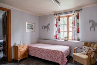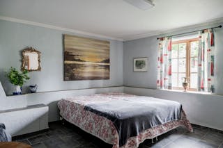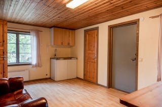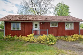 Liten stuga/förråd om 10 kvm i anslutning till övriga stugor. Rödmålad träpanel och tak belagt med betongpannor.