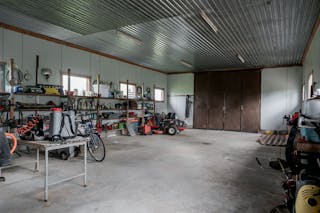 Dubbelgarage och verkstad om ca 8*20 m (160 kvm). Gjutet golv, välisolerad, väggelement klädda med träpanel, ytter- och innertak belagt med plåt. Port på gavel. Dubbla portar till garagedelen. Försedd med vatten, avlopp och el.