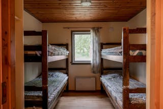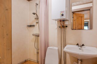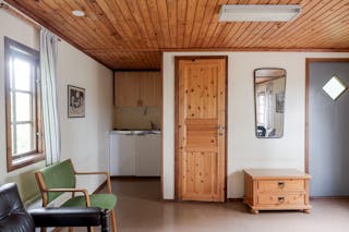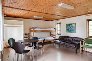 2 st stugor om ca 25 kvm vardera inrymmandes allrum med sovplatser, pentry och mindre badrum med WC, tvättställ och dusch. Enkel standard med äldre ytskikt. En av stugorna är försedd med en luft/luft-värmepump, i övrigt med elelement. Rödmålad träpanel och betongpannor på taken.
