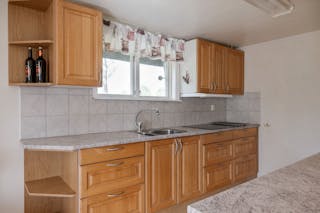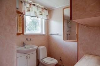 Bostadshus/större stuga om ca 78 kvm inrymmandes hall med garderober, 2 sovrum, badrum med WC, tvättställ och dusch. Vardagsrum och kök (kyl/frys, spis, ugn, mikro) i öppen planlösning med utgång till mindre altan som vetter åt söder. Enkel standard med laminatgolv. Värms med luft/luft-värmepump. Rödmålad träpanel och betongpannor på taket. Totalrenoverad 2006 och belägen i utkanten av stugbyn.