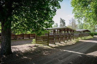 88 utespiltor för uppstallning vid hästvård. Uppförda i trä med plåttak. I anslutning finns en vattenbassäng med fontän som dricksvatten till hästarna.