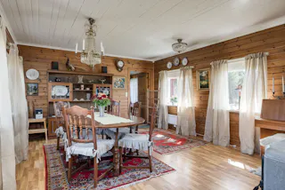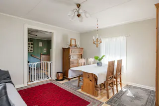 Ljust rum med plats för matgrupp. Laminatgolv och ljusa tapeter. Fint ljusinsläpp från två väderstreck.