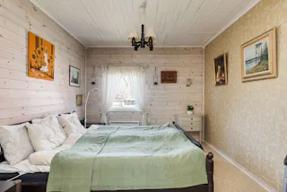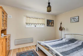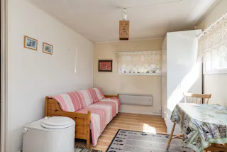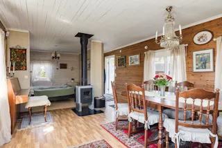 Rymligt allrum som även nyttjas som sovrum. Här finns en kamin som skapar både värme och trivsel. Trägolv och ett härligt ljusinsläpp ger rummet karaktär.