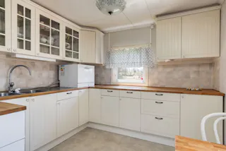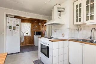 Lantligt kök utrustat med spis, spisfläkt, bänkdiskmaskin, mikrovågsugn samt kyl och frys. Vitt kakel ovan diskbänk samt målade väggar och panel. Härifrån nås både vardagsrum och allrum.