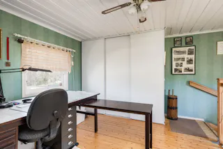 Rum som lämpar sig som kontor eller mindre sovrum. Trappa till källarplan. Tapetserade väggar i grön ton samt trägolv. Garderober med skjutdörrar.