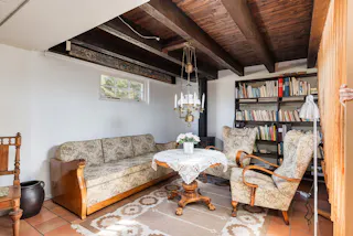 Trivsam gillestuga med braskamin. Klinkergolv och ljusa putsade väggar.