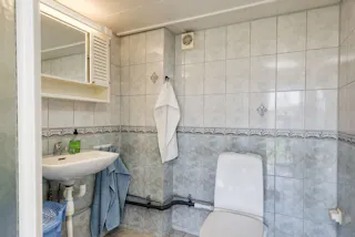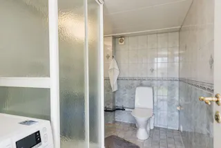 Badrum med kaklade väggar och klinkergolv. Utrustat med duschkabin, wc, handfat, spegelskåp samt tvättmaskin.