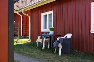 Fristående gäststuga om ca 21 kvm fördelat på två rum. Stugan är perfekt för långväga gäster eller som ett ostört hemmakontor. Byggnaden står på torpargrund och har trästomme, träfasad och plåttak. Fönstren är av typen 2-glas kopplade. El finns indragen och uppvärmning sker via elradiatorer. Byggnaden saknar vatten och avlopp.