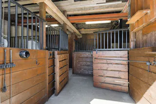 I byggnaden finns ett stall med tre boxplatser och full takhöjd, vilket skapar en luftig och funktionell stallmiljö. Det äldre fähuset är bevarat och ovanför detta finns en loge som ger extra förvaringsutrymme.