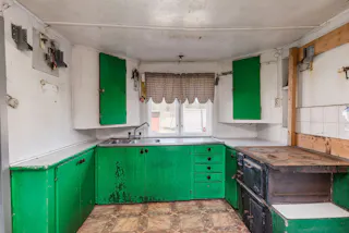 Lantligt och enkelt kök med äldre inredning, diskbänk och traditionell köksspis. Trägolv bidrar till den genuina torpkänslan.