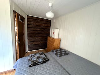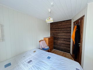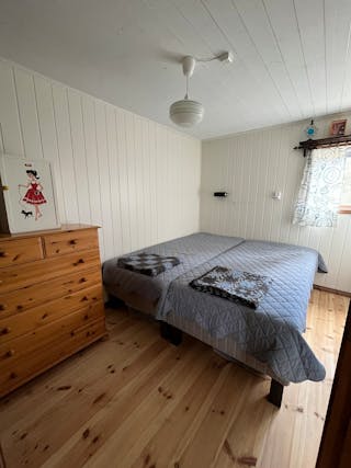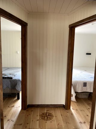 Den nyligen utbyggda delen inrymmer två fina sovrum med furugolv, vita panelskivor som väggbeklädnad samt en vägg i vardera sovrum där timmerväggen är synlig.