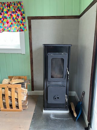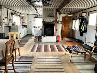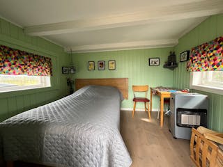 Renoverad gäststuga (2020) med plats för dubbelsäng samt mindre bord. Mindre kamin installerades här i samband med renoveringen.