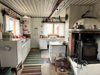 Storstuga med hall, allrum och kök med trägolv, grå boasering samt vita panelskivor ovanför. Köket har grå luckor, rostfri diskbänk, gasolspis, vedspis samt gasolkylskåp.
