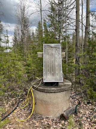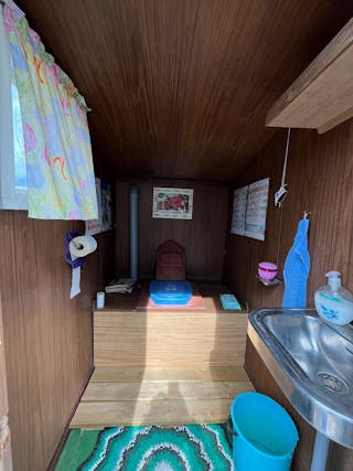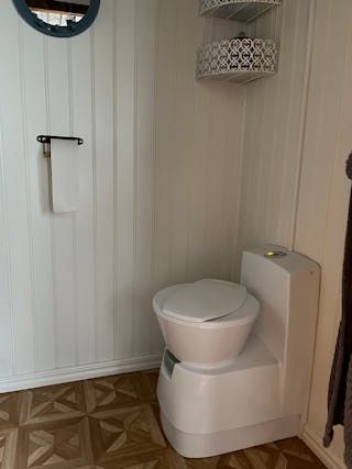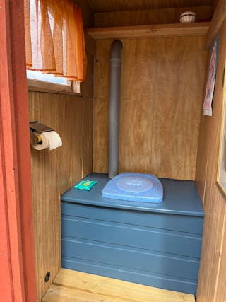 Egen vattenbrunn, testad och godkänd 2017 och eget 12-Voltssystem som laddas via solpaneler.