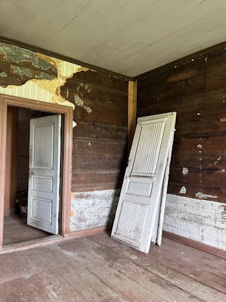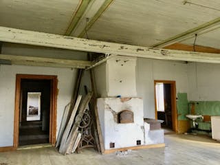 Rumsdisposition — golv, dörrar och tak är så gott som orörda sedan 1800-talet. Takhöjden är 3 m och byggnadsarean är ca 200 m2.