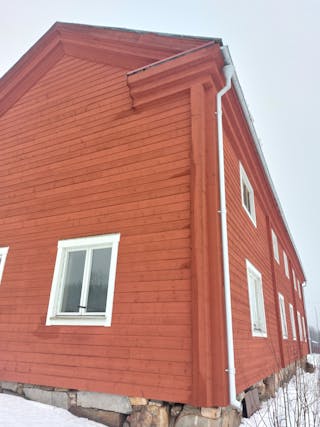 Ägaren har också besiktigat timringen genom att riva den gula aluminiumbeklädnaden som huset försågs med på 1980-talet. Timringen är välbevarad men har diverse skador, speciellt på gavelpartierna. För att skydda timringen rådde länsantikvarien ägaren att panelklä fasaden, vilket gjordes 2015. Panelen är liggande och målad med ljus falurödfärg.