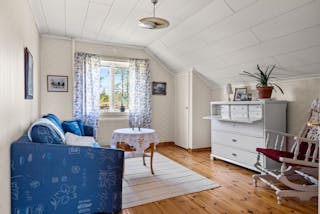 Övervåning med vardagsrum och tre rum varav ett använts som sovrum.