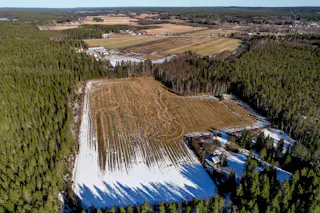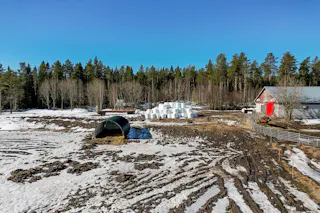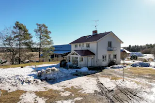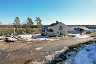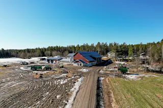 Bostadshuset är smakfullt placerat på en höjd, lagom avskilt från lantbruksdelen, och omges av en trivsam tomt med grillplats, pallkragar, sandlåda samt uppvuxna träd och planteringar – en inbjudande miljö för både avkoppling och familjeliv.