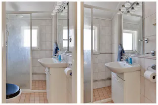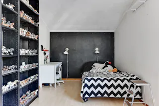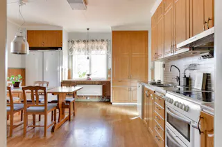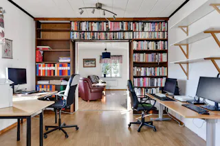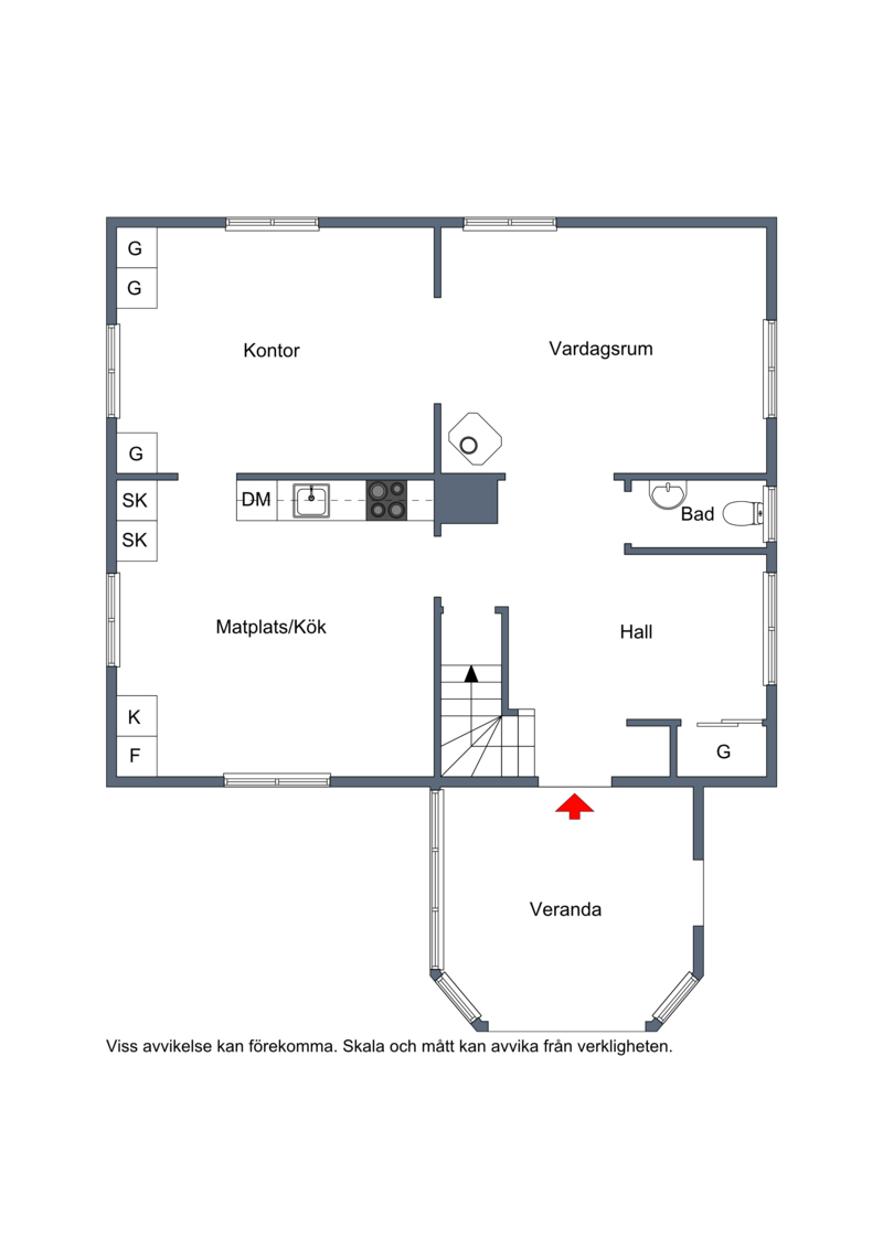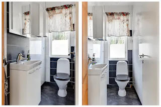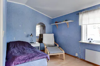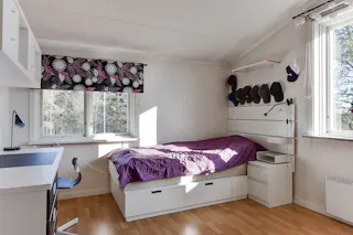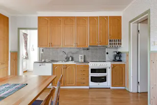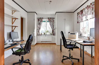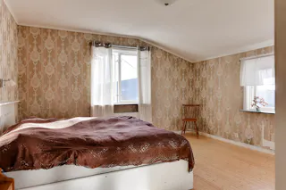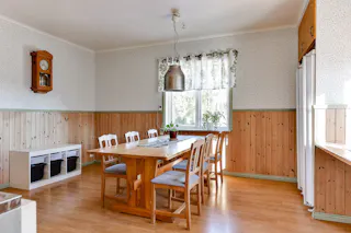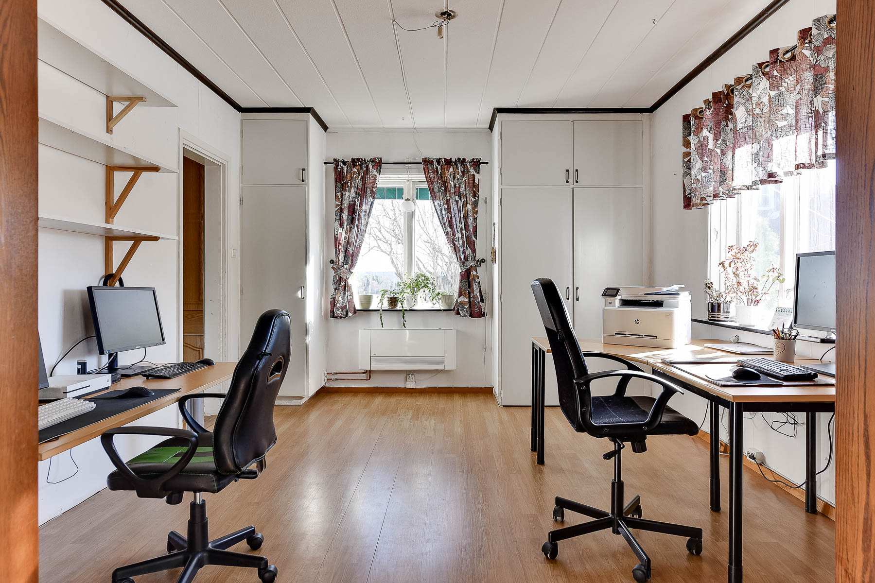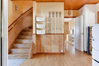 Vidare finns en rymlig inre hall med skjutdörrsgarderober som erbjuder god förvaring. Köket är generöst tilltaget med plats för större matgrupp. Intill köket ligger ett arbetsrum eller sovrum med skjutdörrar mot vardagsrummet. I vardagsrummet finns en täljstenskamin, och fönster i vinkel ger fint ljusinsläpp. På entréplanet finns även en WC med elgolvvärme, svart golv och vitt kakel på väggarna.