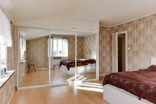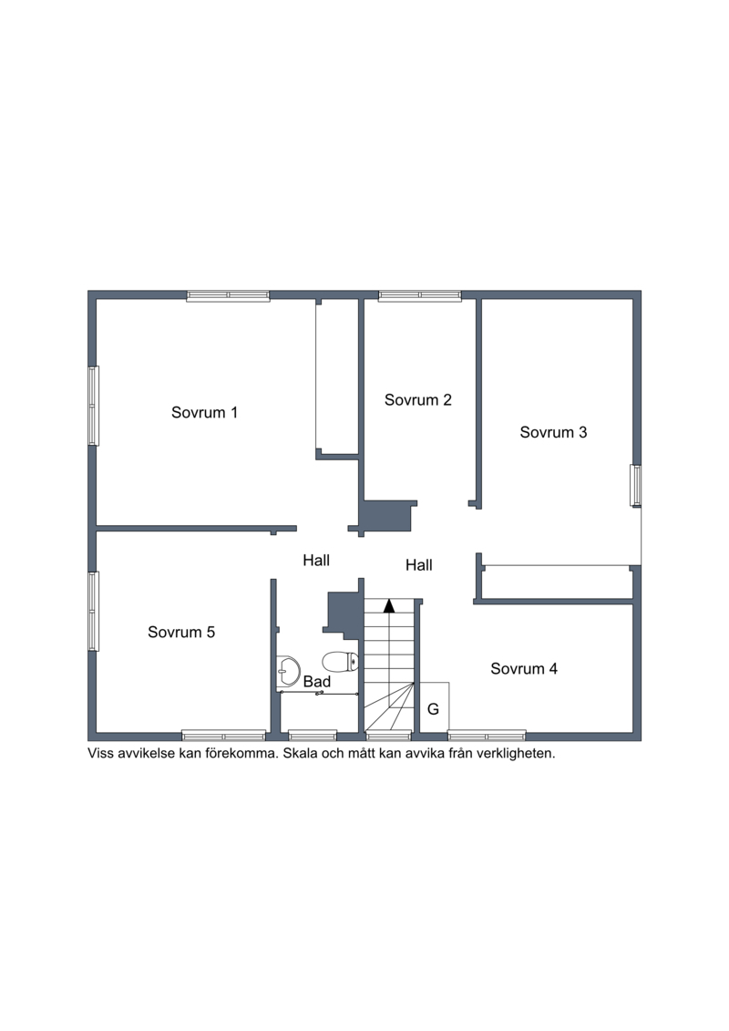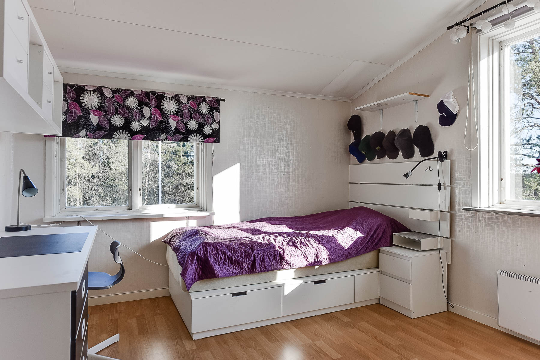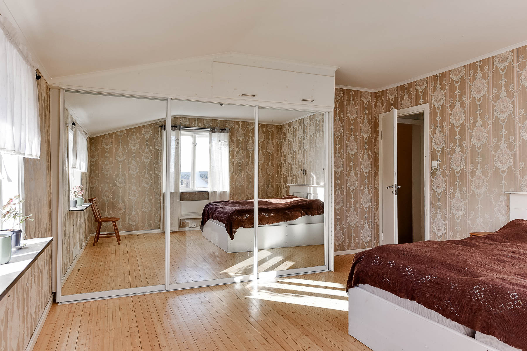 Övre plan rymmer fem sovrum med goda förvaringsmöjligheter i skjutdörrsgarderober och platsbyggda lösningar. I det största sovrummet ligger trägolv, medan övriga rum har laminatgolv. Här finns också ett badrum utrustat med dusch med skjutduschvägg, kakel och klinker i beige toner, elgolvvärme, handdukstork, WC samt handfat med kommod och spegel.