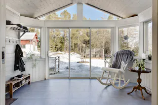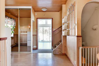 Entréplanet inleds med en inglasad altan som byggdes till för cirka 10 år sedan. Rummet har golvvärme och stora fönsterpartier, vilket ger ett ljust och öppet intryck samt utgång till altan och uteplats.